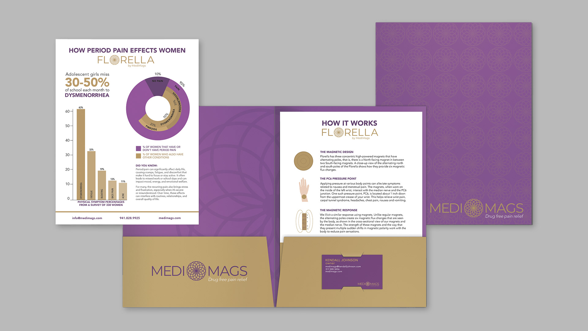 This branded folder and insert set was created for Florella by MediMags, designed to communicate product information in a clear, cohesive, and visually engaging way. The layout combines clean typography, data visualization, and a refined purple and gold color palette to reflect a sense of trust, wellness, and professionalism. This folder and its inserts effectively educates the audience while maintaining a polished and approachable aesthetic.