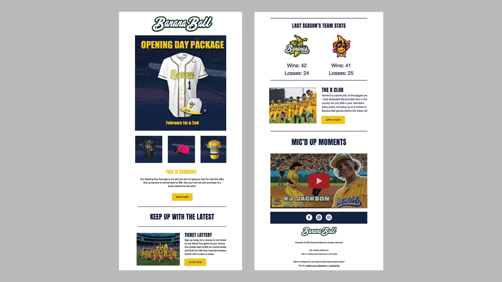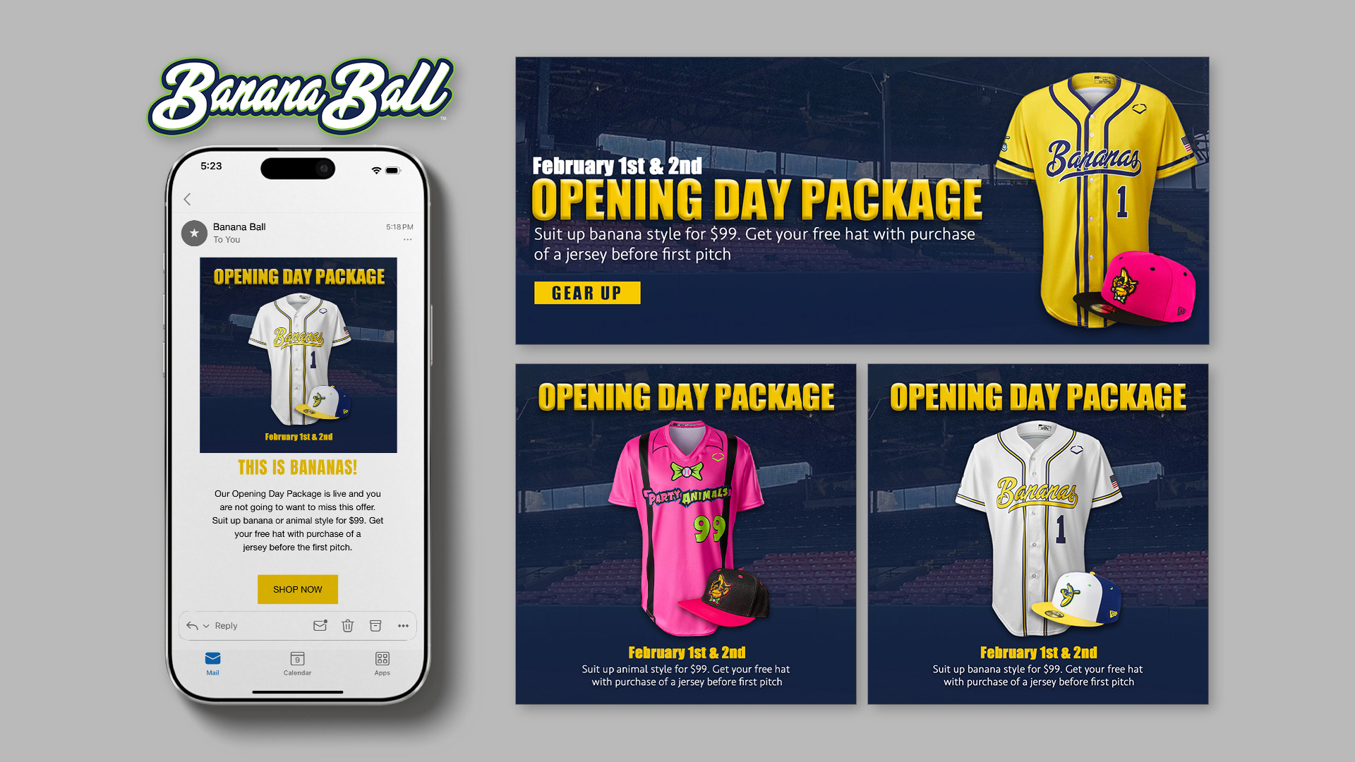 Made for Banana Ball Opening Day, this merchandise promotional campaign and e-newsletter was created to showcase the sport’s energetic and playful identity through bold color, dynamic layouts, and cohesive visual storytelling. This campaign and e-newsletter feature designs that highlight the excitement of Opening Day. These graphics were developed to engage fans across digital platforms and deliver a vibrant, memorable introduction to the season.