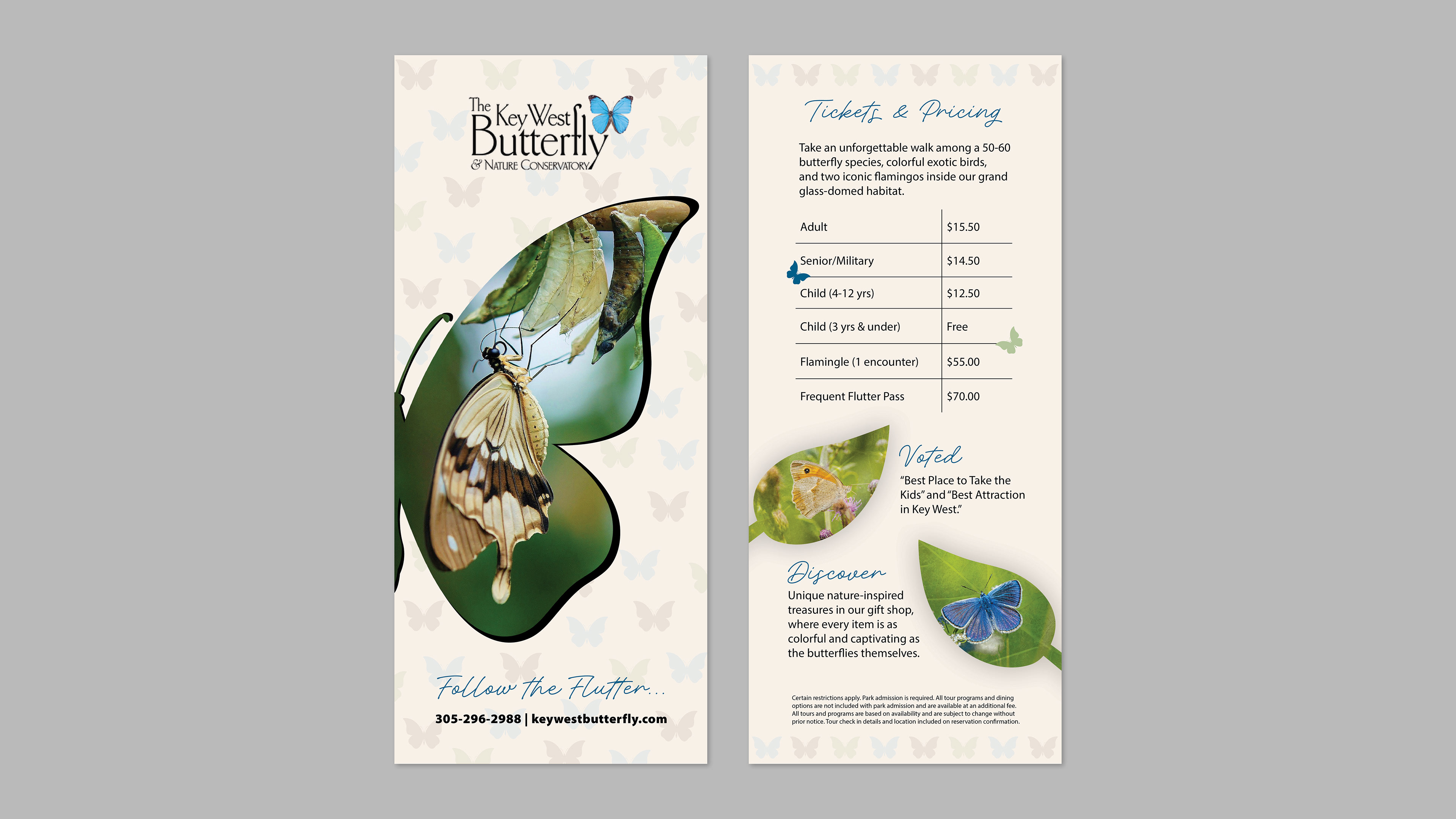 Made for The Key West Butterfly Conservatory, this rack card was designed to captivate visitors with vibrant visuals and clear, inviting information. The layout features a tan, blue, and green color palette, engaging photography of butterflies, and typography that reflects the conservatory’s lively environment. This rack card serves as both an informative guide and a memorable visual introduction to the beauty of the conservatory.
