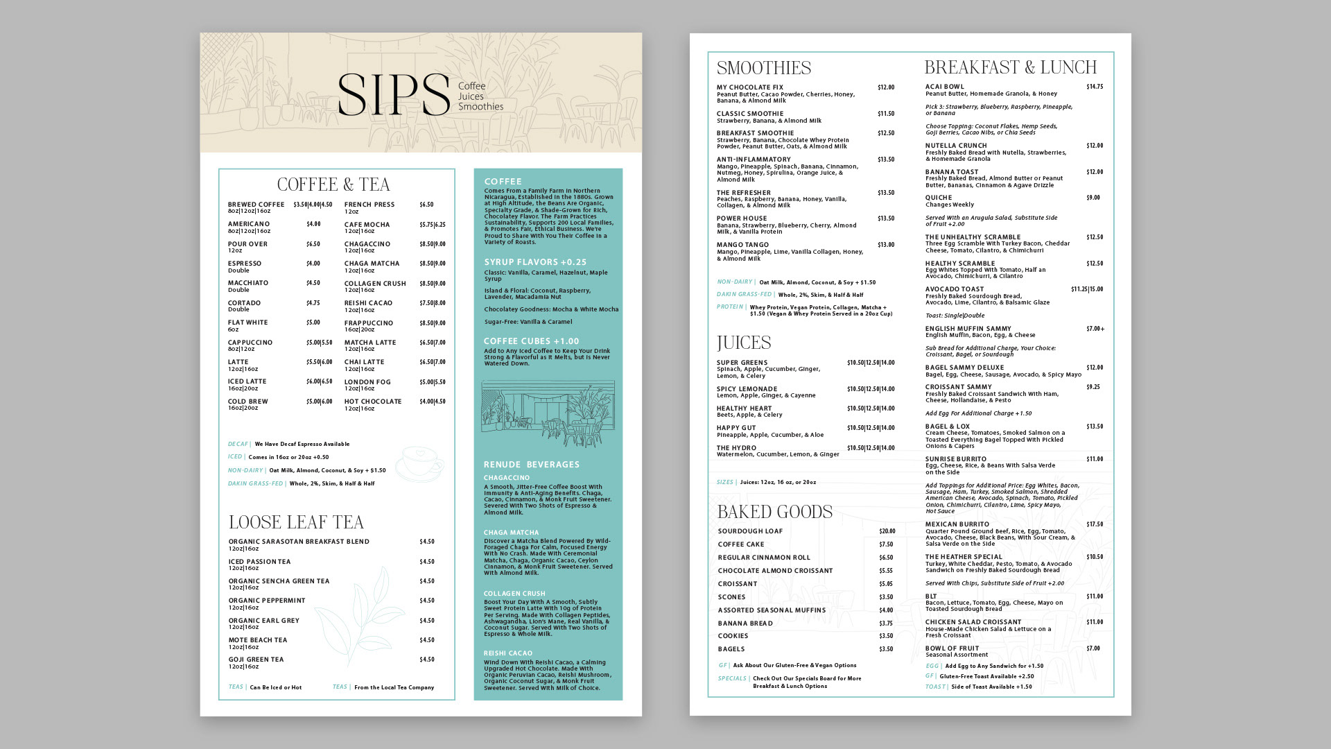 Designed for Sips on Longboat Key, this project focuses on creating a cohesive brand experience across menu design, merchandise, and a website. A clean, approachable visual style ties each element together, reflecting the coffee shop's relaxed atmosphere while ensuring consistency both in-store and online.