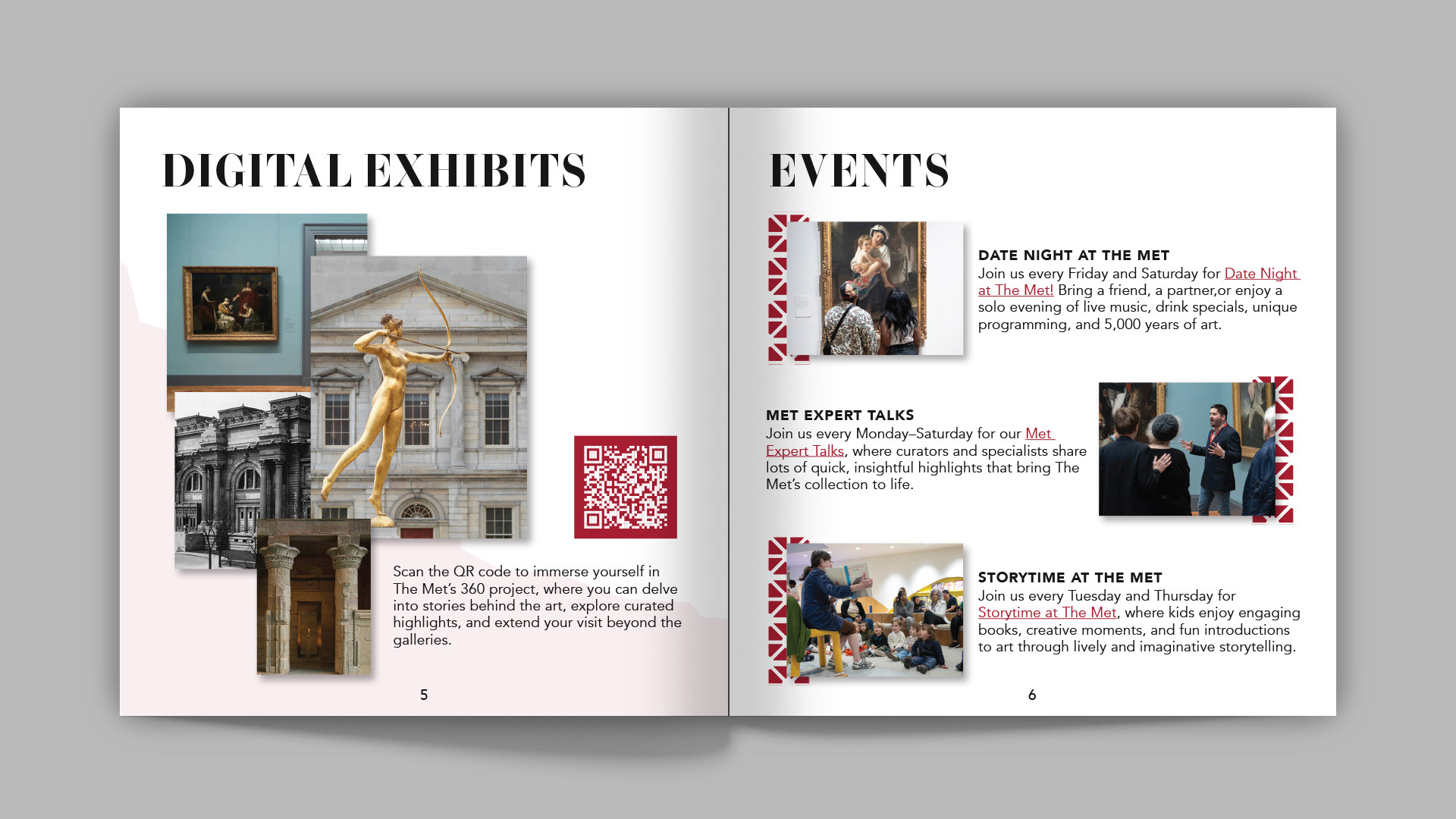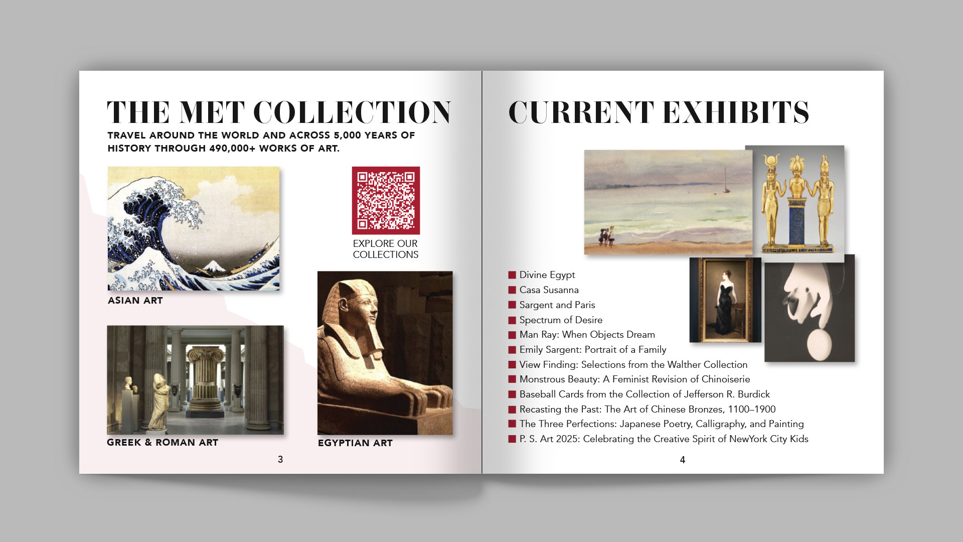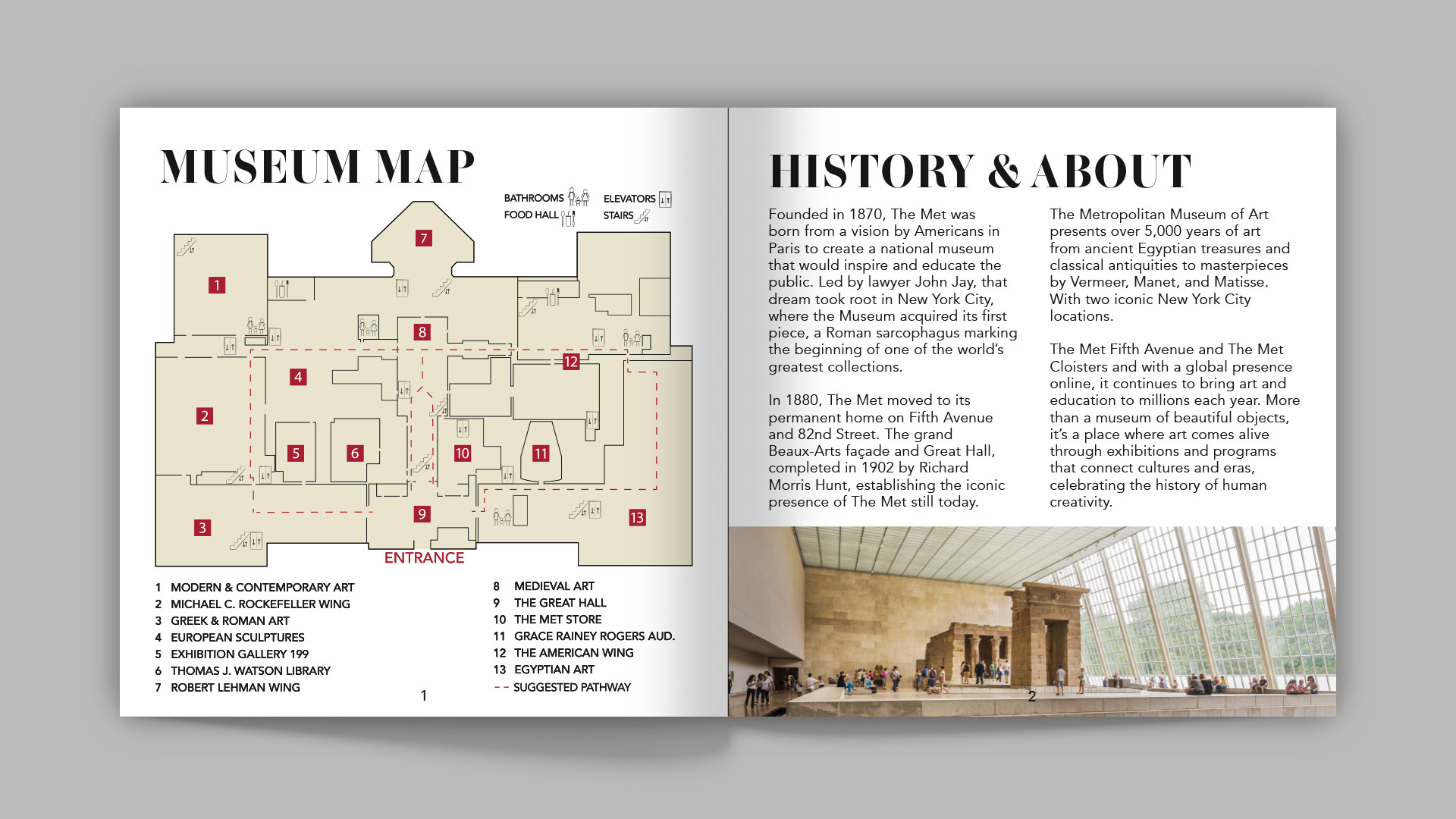 This 16-page book for the Metropolitan Museum of Art was designed as a companion piece to a cohesive Wayfinding system, guiding visitors both visually and informationally through the museum experience. The layout balances elegance and clarity, organizing key content such as exhibitions, events, tickets, donations, museum history, and more into an intuitive, easy-to-navigate format. Drawing inspiration from the museum’s architecture and timeless aesthetic, the design integrates refined typography, structured hierarchy, and bold accents to create a seamless connection between print and digital navigation.