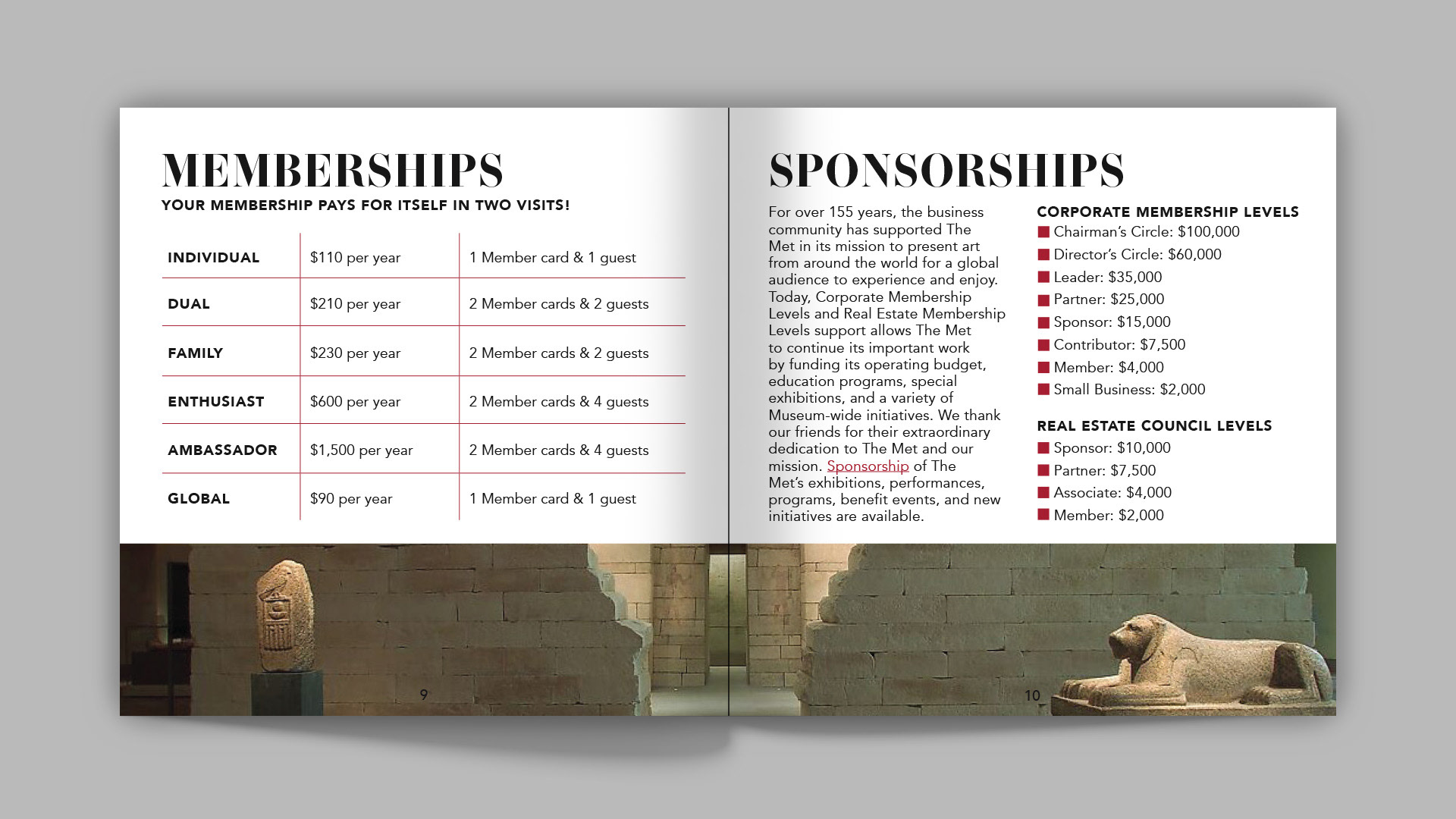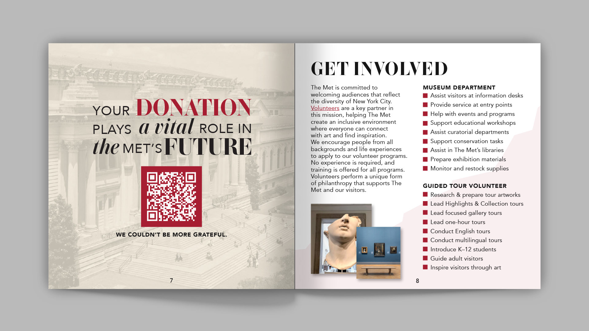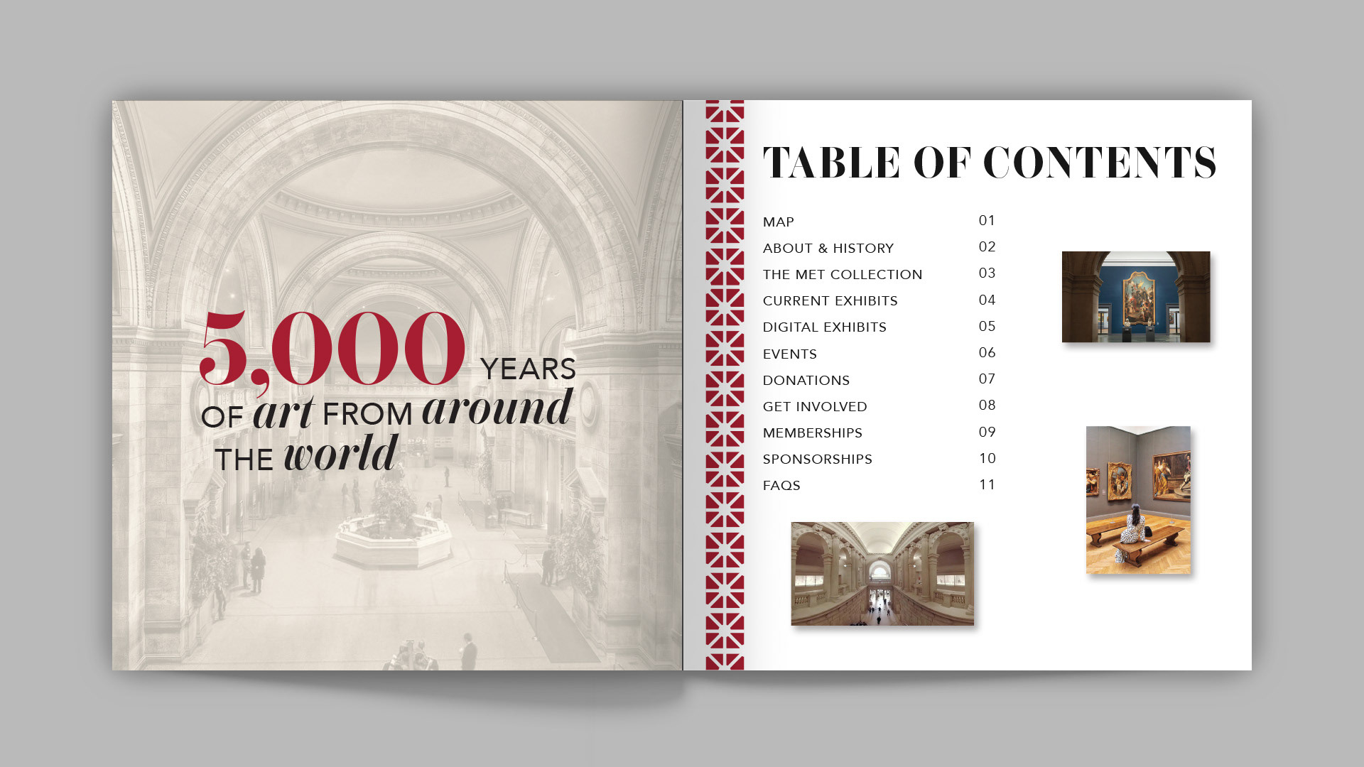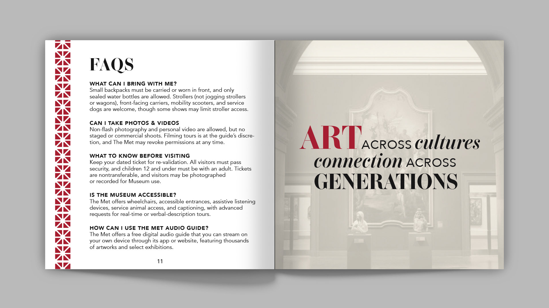This 16-page book for the Metropolitan Museum of Art was designed as a companion piece to a cohesive Wayfinding system, guiding visitors both visually and informationally through the museum experience. The layout balances elegance and clarity, organizing key content such as exhibitions, events, tickets, donations, museum history, and more into an intuitive, easy-to-navigate format. Drawing inspiration from the museum’s architecture and timeless aesthetic, the design integrates refined typography, structured hierarchy, and bold accents to create a seamless connection between print and digital navigation.