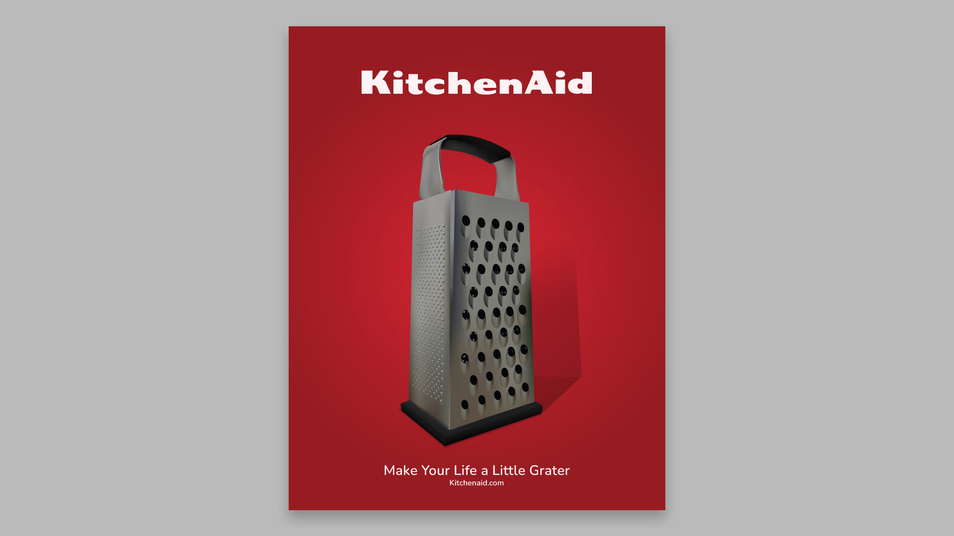 This vector realism advertisement for KitchenAid transforms a simple kitchen tool into a bold, visually striking focal point. The design features a highly detailed vector illustration of a box grater, rendered with realistic lighting, reflections, and texture to mimic a polished metal surface. Set against a vibrant red background, the composition creates a strong contrast.